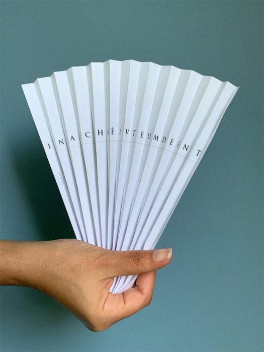 L’éventail à philosopher est un objet humoristique (« à destination principalement des artistes en général »). Grâce à la technologie lenticulaire, il pose les termes d’un problème inhérent à toute création. Comment terminer une œuvre ? Il existerait une forme parfaite qu’il faudrait atteindre, ou bien l’œuvre serait nécessairement inachevée car la limite de la finitude serait inatteignable laissant ainsi l’œuvre inachevée et toujours perfectible ? À partir de quand une œuvre est-elle terminée ? Quand faut-il donc s’arrêter ? Telles sont les questions qui peuvent agiter votre esprit échaudé tandis qu’une de vos mains brasse un air bienvenu car frais !